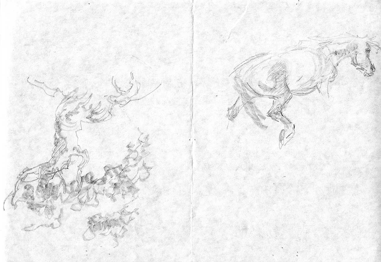 Crayon à papier, lavis et encre rouge sur papier faible grammage.
